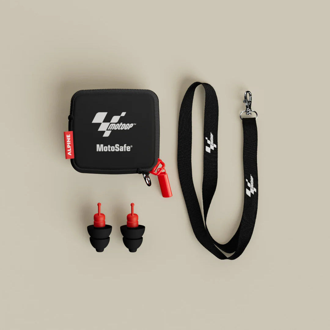 MotoSafe Race in the MotoGP™ version - Ideal earplugs for riding on the motorway, race track or with an open-face helmet. MotoSafe® earplugs muffle harmful sounds without making you feel disconnected from your surroundings. Other traffic, the navigation system, the intercom and the engine itself all remain clearly audible thanks to the innovative AlpineAcousticFilters™.