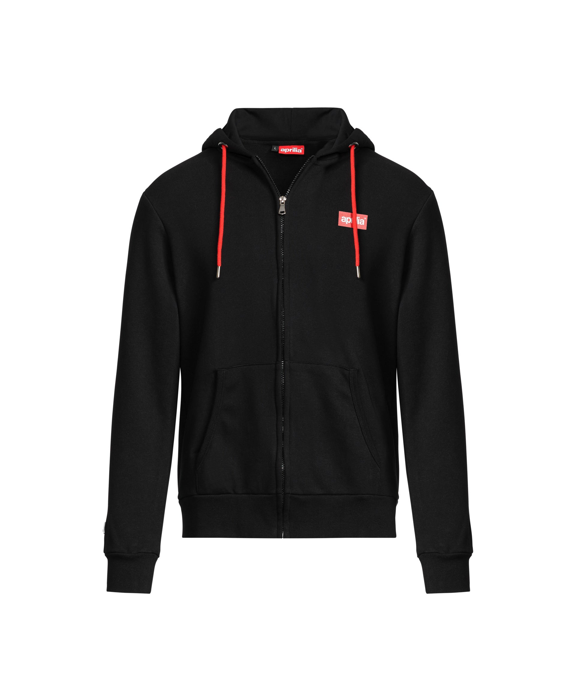 The Aprilia men's sweatshirt is made with an ungauzed French Terry inner that offers lightweight warmth ideal for all seasons. The cotton reinforcement tape on the collar ensures superior durability, while the contrasting zip with metal puller adds a graphic touch. The kangaroo pocket with ribbed trim, tone-on-tone bonded hood, and ribbed cuffs/bottoms complete the garment. With the Aprilia logo print on the heart, the bold lettering on the back and the soft PVC patch application on the sleeve, this sweatshirt is a mix of style and high quality details.