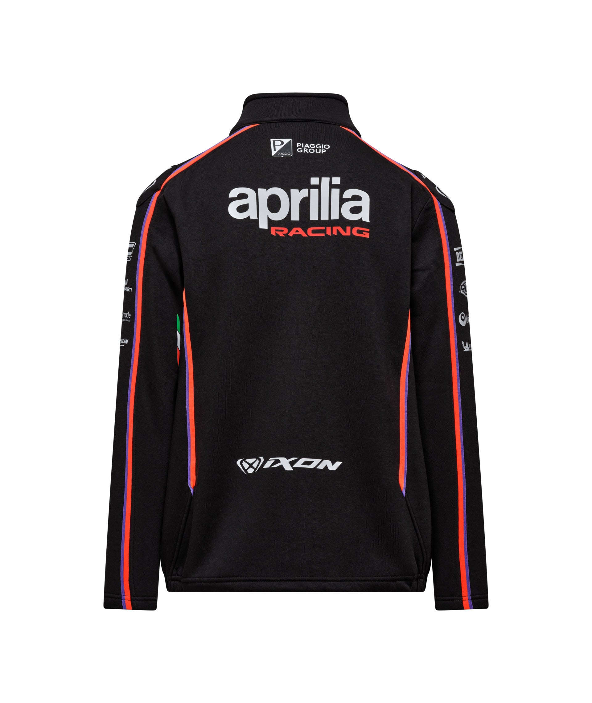 The Aprilia men's sweatshirt is made with an ungauzed French Terry inner that offers lightweight warmth ideal for all seasons. The cotton reinforcement tape on the collar ensures superior durability, while the contrasting zip with metal puller adds a graphic touch. The kangaroo pocket with ribbed trim, tone-on-tone bonded hood, and ribbed cuffs/bottoms complete the garment. With the Aprilia logo print on the heart, the bold lettering on the back and the soft PVC patch application on the sleeve, this sweatshirt is a mix of style and high quality details.