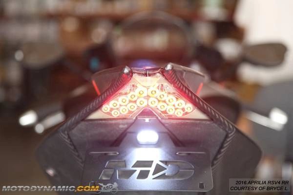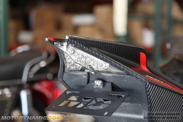 Note: Due to Aprilia's 1 piece main wiring connector that controls the left and right turn signals as well as the license plate light, there is no way to utilize this tail light while the OEM rear fender/harness is attached. This means you will lose your license plate light connection. We highly recommend to purchase our fender eliminator kit to go along with this tail light because it comes with its own LED license plate light.