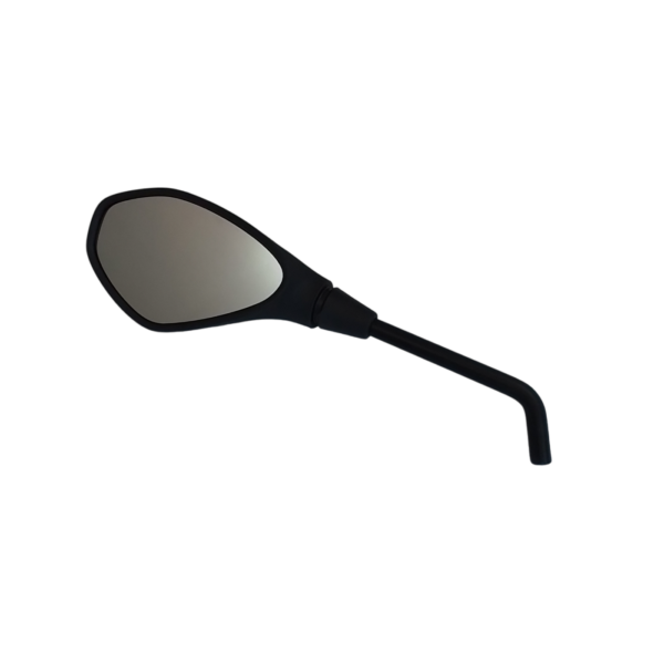 High-Quality Plastic Mirror with Black Painted Metal Stem, Diameter 12 mm. The reflective surface has a maximum width of 130 mm and a maximum height of 80 mm. Handlebar fixing with a right-hand (standard) M10 threaded clamp and rubber cap to protect the mounting from water infiltration.