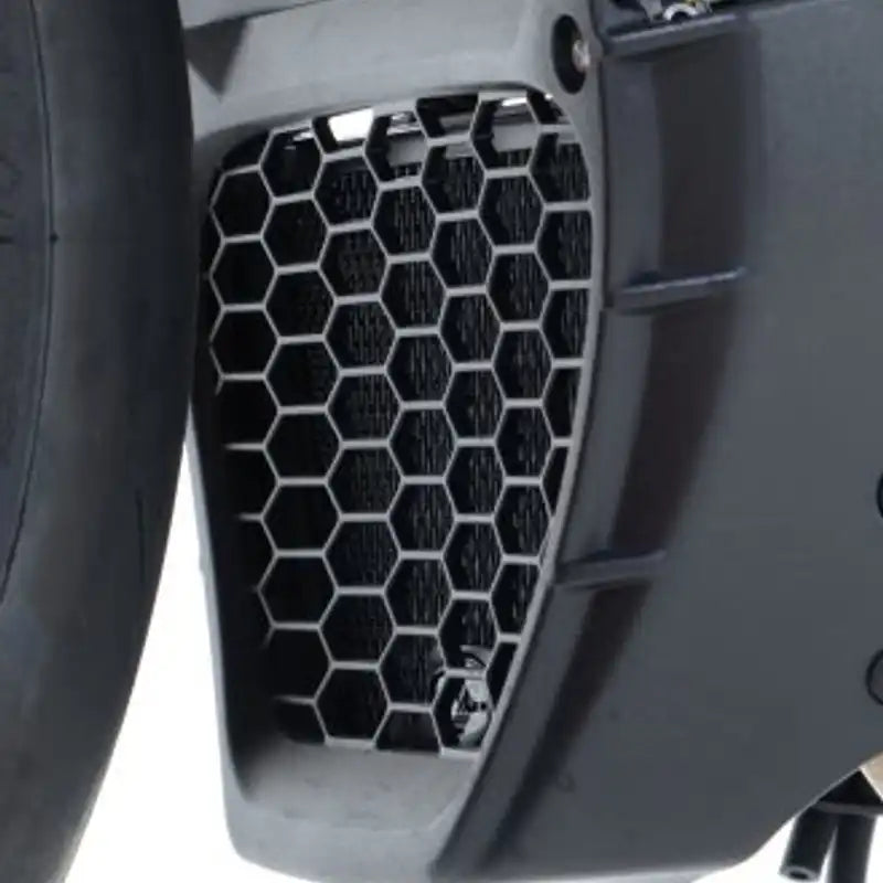 R&G Oil Cooler Guards are available in a black or titanium finish. They are made from pressed aluminium and feature a neat, seamless frame. They improve the looks of your bike and help to protect your expensive and vulnerable oil cooler from flying debris.