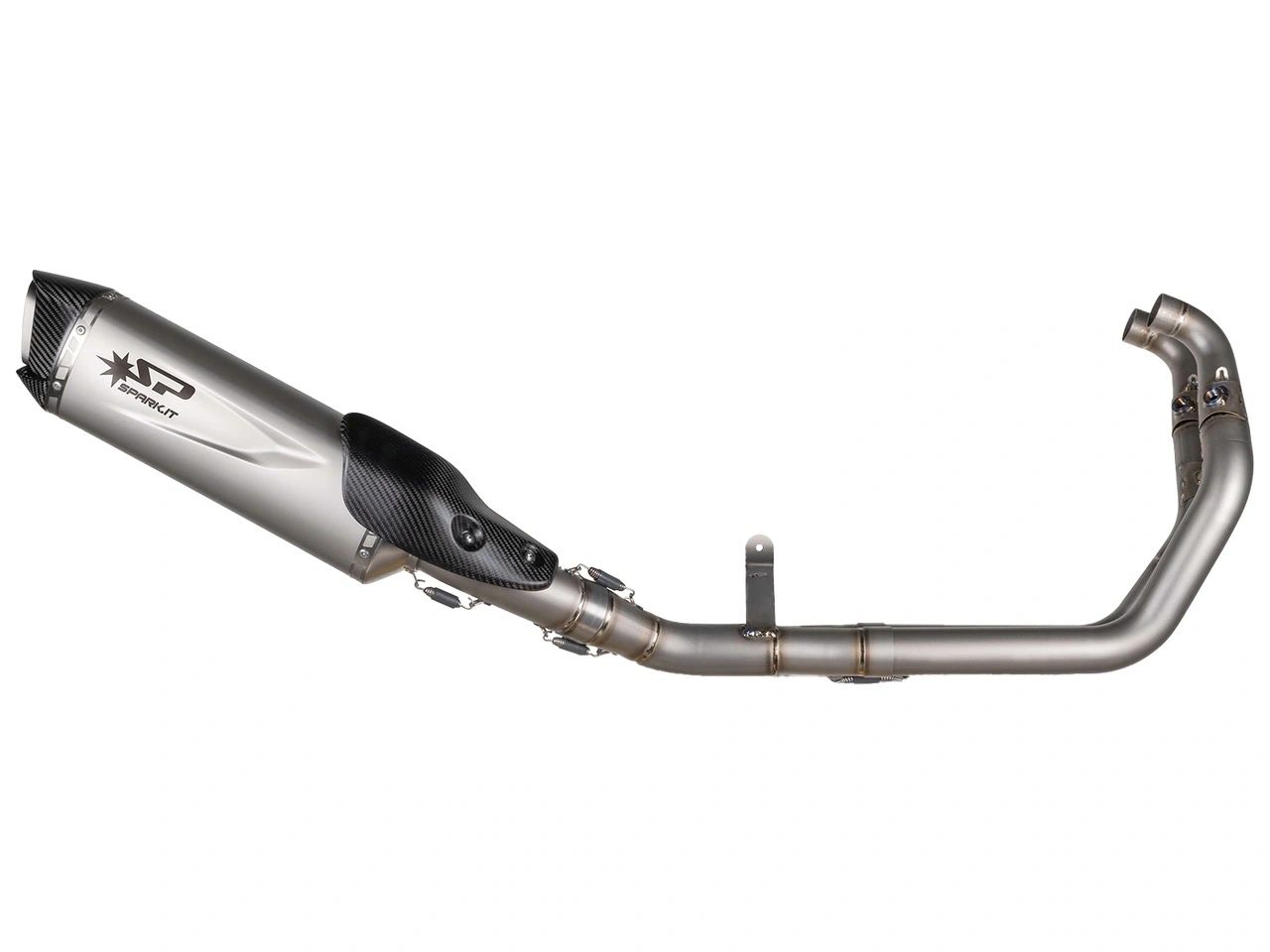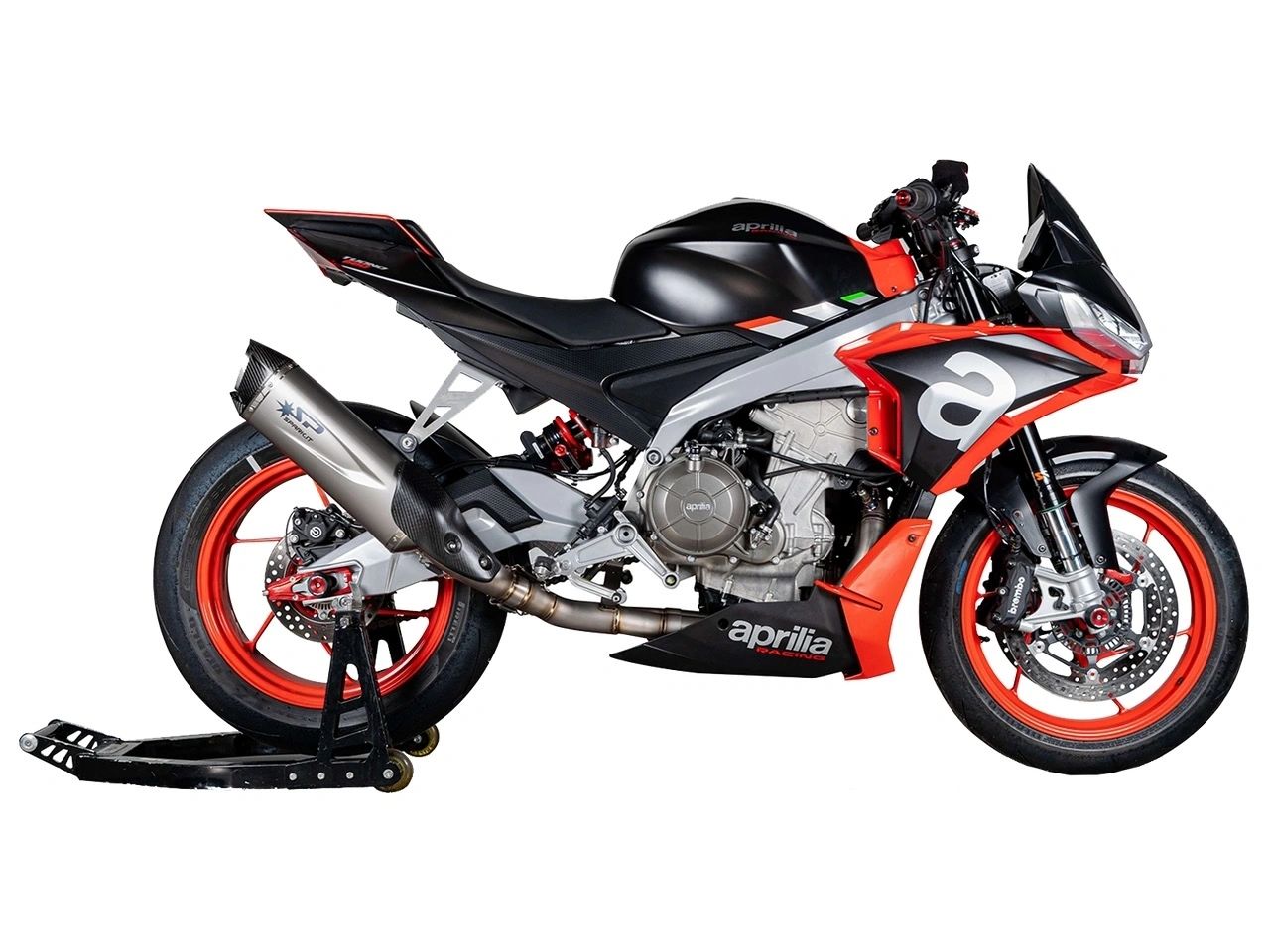 Spark Exhaust Technology Aprilia RS 660 "Force Evo" Titanium Exhaust. Constructed with a titanium silencer fitted with carbon ending, titanium mid-pipe and titanium racing header. Incredible weight saving (weighs only 3.6 kg vs stock at 6.5kg).